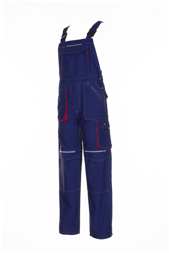 A great fit from head to toeA classic workwear item, Basalt Dungarees are comfortable to wear and will not fall down thanks to the raised back, while the reflective piping is a stylish design element.Additional InformationProduct lines: Basalt WorkwearColour: navy/redProduct group: 2832MaterialMain colour: 65 % polyester, 35 % cotton, approx. 260 g/m², Ripstop lookContrasting colour: 65 % polyester, 35 % cotton, approx. 285 g/m²Design: Reflective piping 3M™ Scotchlite™ Reflective material 8912N silverExtra2 patch knee pockets which are opened from aboveDouble ruler pocket on the rightThigh pocket with flap and Velcro closure on the leftMobile phone pocket on the leftBib pocket with flap and Velcro closure2 back pockets with flap and Velcro closureZip flyAdjustable waistband with jeans buttonHigh back with bracesBraces have elastic insert, buckles on the bracesReflective stripsHammer loopSizes: 42 – 44 – 46 – 48 – 50 – 52 – 54 – 56 – 58 – 60 – 62 – 6490 – 94 – 98 – 102 – 106 – 11024 – 25 – 26 – 27 – 28 – 29Care instructions