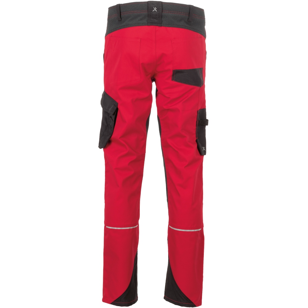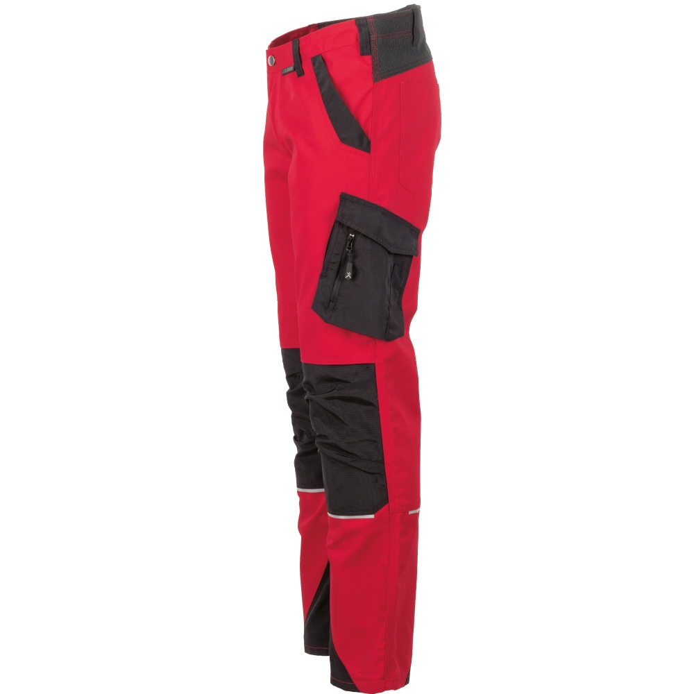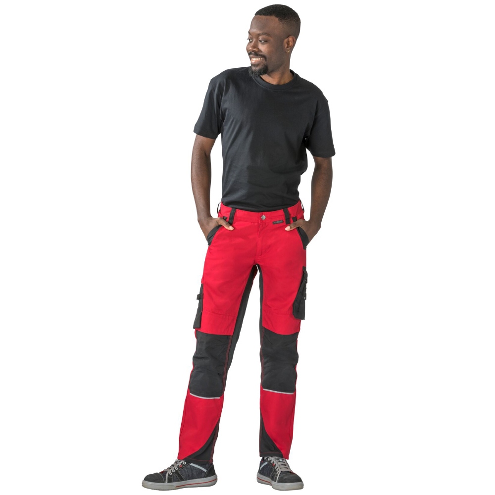 Light work trousers for optimum freedom of movementLight material and elastic inserts in the crotch and on the seat ensure the perfect fit and give you the freedom of movement that you need. The light blended fabric is extremely easy to clean. The areas subject to the most wear are reinforced with nylon with a two-tone finish.Additional InformationProduct lines: Norit WorkwearColour: red/blackSizes: 24 – 29 (short), 42 – 64 (standard), 90 – 110 (long)MaterialOuter fabric65 % polyester, 35 % cotton,approx. 245 g/m²Reinforcements100 % nylon,approx. 195 g/m²Elastic insert95 % polyester, 5 % elastane,approx. 165 g/m²Extra2 patch knee pockets which are opened from aboveDouble ruler pocket on the right with compartment for pens and fastening option1 thigh pocket with flap and Velcro closure on left legMobile phone pocket on the left with zipWaistband with elastic insert on the seatElastic insert in the crotch2 rear pocketsZip flyWaistband with 7 belt loops and jeans buttonReflective appliqués