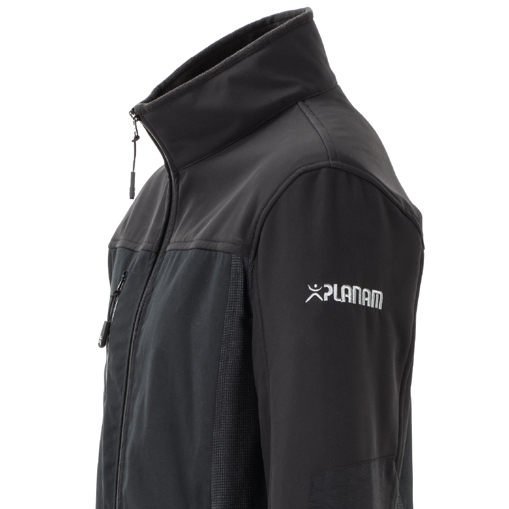 The perfect combination of polyester and cotton makes you look good and ensures the clothes are always comfortable to wear.main colour material: 65% polyester, 35% cotton approx. 245 g/m²Contrasting material Softshell outer layer: 96% polyester, 4% elastane, TPU membrane, approx. 260 g/m²Contrasting material Softshell inner layer: 100% polyester FleeceReinforcements: 100% nylon, approx. 195 g/m²Elastic insert: 95% polyester, 5% elastane approx. 165 g/m²Colour: blackSpecifications2 side pockets with zip and robust flap1 breast pocket on the right with zipReflective piping on the breast pocket and on the backFront zipFleece lining in the collar, arms and shouldersElbows with robust trimSide stretch insert for optimum fit? Information on product safety (Manufacturer, Contact)PLANAM Arbeitsschutz Vertriebs GmbH, Letter Strasse 50, 33442 Herzebrock-Clarholz, GERMANY, +49 5245 8606-0, , www.planam.de