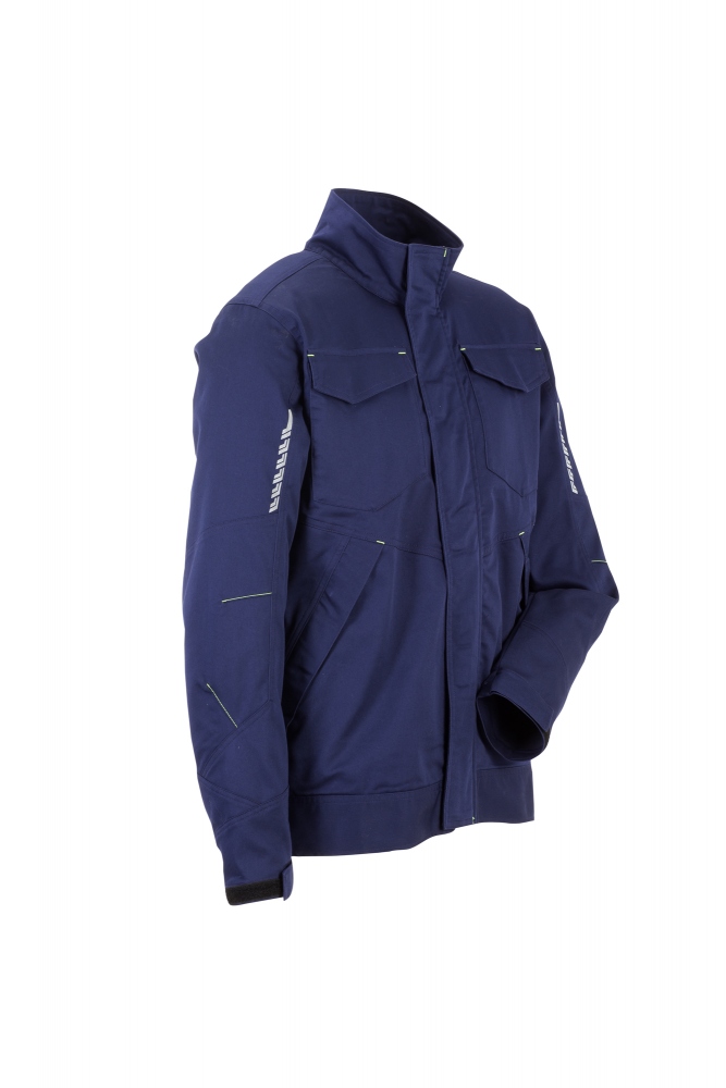 The waisted jacket doesn’t just have an impressive classic design. Flaps on the pockets and zips protect the contents and workpieces alike during work.Colour: navyOuter fabric: 64% cotton, 33% polyester, 3% elastane approx. 265 g/m²Lining: 96% polyester, 4% elastane approx. 110 g/m²Specifications2 side pockets with zip and flap with Velcro2 chest pockets with flap and VelcroReflective appliqués on the arms and backFront zip with flap and VelcroStand-up collar and chin protectionAdjustable cuffs with Velcro?