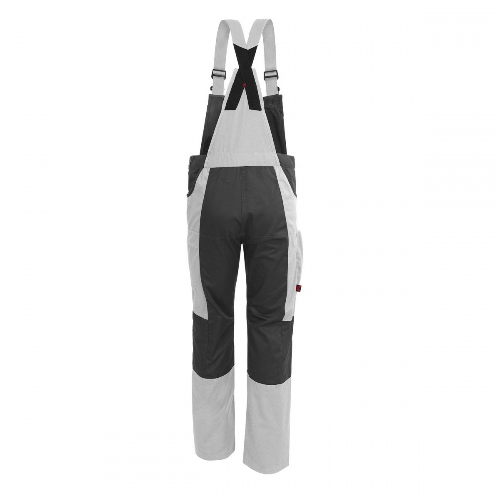 Modern men’s work dungarees Qualitex® X-Serie for universal use4 pockets and clear lines with a simple, timeless and yet modern design meet the usual high-quality workmanship and the established fabric blend from Qualitex.Material: high quality 2-colored mixed fabric (65% polyester/35% cotton), approx. 245g/m²Weight: approx. 0,7 kgSizes: 42-68 and 90-110 ()Color: white/grayAlso available in , and SpecificationsStraps with elastic inserts and bucklesOpening on the left side with two buttonsAdjustable elasticated waistband in the backFly with plastic zipperPreformed knee pad pockets, knee pads to be inserted from belowX-bars partly in red, partly tone-on-toneRaised cross back On request, we can print your company logo on these dungareesPockets1 bib pocket with patch pocket closable with plastic zipper, additional pen compartments on both sides1 tool pocket on the left1 open pocket under the right shoulder strap2 large side pockets extended to the back with separation seams forming 1 large pocket on the right and 1 smaller pocket on the left1 ruler pocket on the right side with pen compartment1 left thight pocket with flap coverFields of applicationPaintersPlasterersMasonsAgrifood industries Industrial maintenanceOutdoor and indoor