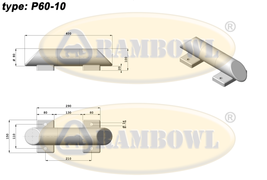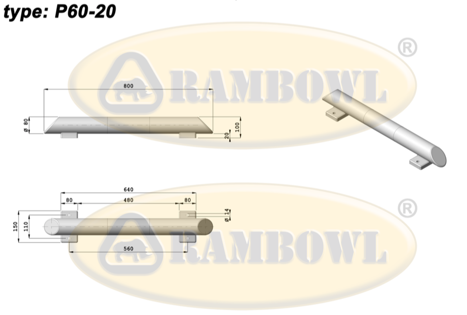 Rambowl P60 Crash Protection Bars in PolyurethaneRambowl protection guard, polyurethane. Outdoor and indoor use. With adhesive warning reflector.ModelsP60-10, ø80 mm, 400 mm, 3,4 kgP60-20, ø80 mm, 800 mm, 6,2 kgP60-30, ø80 mm, 1200 mm, 8,8 kgDescriptionThe Rambwol © Hoop protection guards are the perfect solution for the protection of buildings, machines and inventory. Fixing material is separately available. With red reflective warn marking and black marking for better visibility. For outdoor and indoor use. The different sizes and shapes offer the right product for each type of use.Massive bull bar made of solid plastic.A solution for outdoor and indoor use.High impact resistant and durable.Yellow, black warning stripes.Additional marking reflector for outdoor use.Suitable for use in the food industry.By means of full material does not need repairs after collisions are installed via the bottom plate by means of ground anchors (sold separately). Information on product safety (Manufacturer, Contact)Dancop International GmbH, Wilhelm-Rausch-Strasse 15, 31228 Peine-Stederdorf, GERMANY, +49 5171 585690, , www.dancop.com
