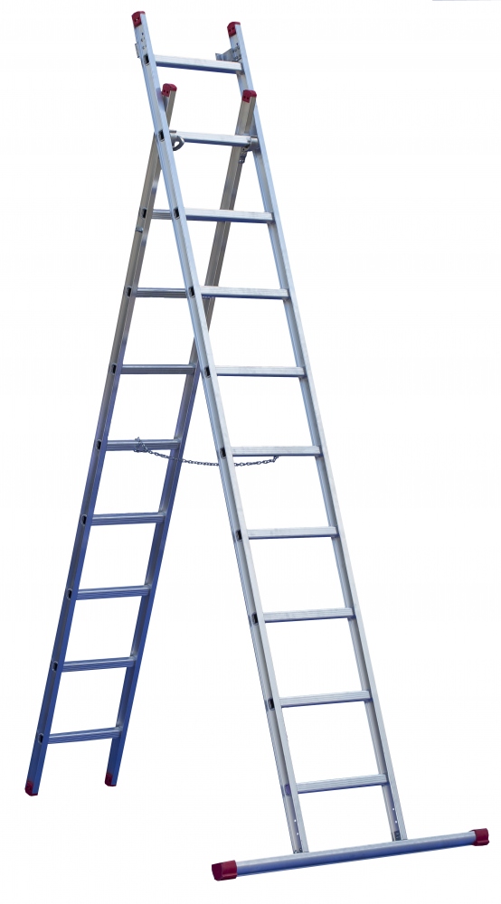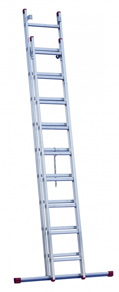 he ladder for professional use at an affordable price. The double delta profile, which is unique in Germany, combined with a special aluminium alloy makes it possible to use it under special loads. The profile is used for the stepladders of the Red Label. For the rung ladders of this series we also use a specially developed double T-profile. Both profiles increase resistance to dents and buckles because of the punch-resist-effect.Manufactured in accordance with DIN EN 131, they correspond to the „Professional class“. In terms of stability and longevity, the standard specifications are even exceeded by far. A reliable „colleague“ for your professional life.Technical details:Can be used as standing and leaning ladderStrong and very stable double-T-profileHighest stile stability against bucklingRobust, consistently stable multiple crimpingVery appealing designHooks with anti-derail deviceComfortable and safe standing position due to 35 mm deep rungsClear width: 400 mmOuter ladder width: 470 mmRung distance: 300 mmRung dimension: 35×35 mmProduct information:Number of steps: 10+10Length in extended version as leaning ladder (cm): 530Length in telescopic version as leaning ladder (cm): 320Length in extended version as standing ladder (cm): 300Length in telescopic version as standing ladder (cm): 227Stabilizer length (cm): 120Weight (kg): 15Benefit-increasing details:Resistance against dents and buckles with the punch-resist-effectExtra wide rungs (35x35mm) and 80mm steps for comfortable, safe standing Rungs and steps with ribbing increase the slip resistanceFlanged connection from stile to rung and step as a permanently stable connectionExtremely anti-slip ladder feet, replaceable after wear and tearAccessoriesFloor protectors for stiles 55×28 mm Information on product safety (Manufacturer, Contact)Hassler & Hassler GmbH u. Co. KG, Dieselstrasse 14, 65520 Bad Camberg, GERMANY, +49 6434 20798-60, , www.rise-tec.de