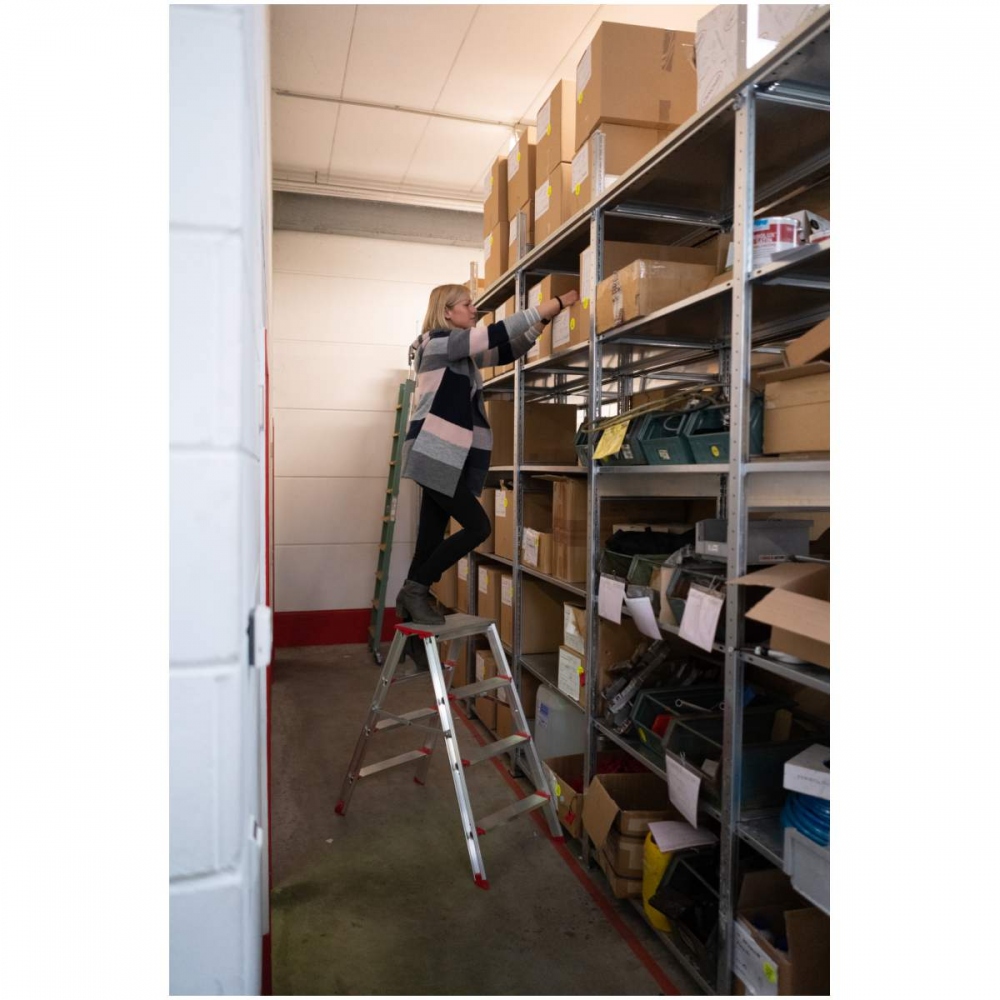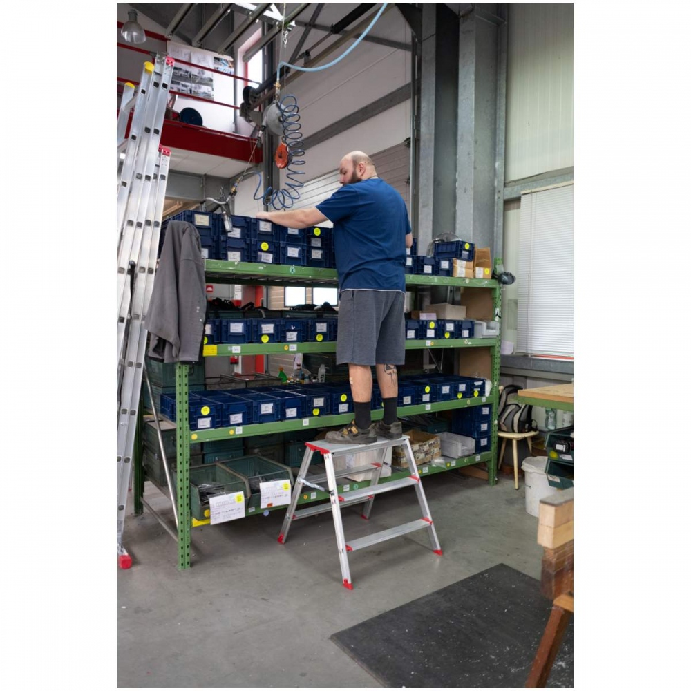 Two sided step ladder with 4 steps for professional use, according to DIN EN 131, height 0.95 mThe ladder for professional use at an affordable price. The double delta profile, which is unique in Germany, enables use in conjunction with a special aluminum alloy under particular stresses. Increased resistance to dents and buckles and extremely non-slip ladder feet make the Rise-Tec® step ladders a stable work tool for daily use.Areas of applicationThe Rise-Tec® professional stepladders are TRBS 2121-2 compliant and therefore suitable for commercial work on the ladderCommercial and industrial useInstallers, painters, roofersWarehousingCaretaker serviceHousekeepingDo it yourselferCharacteristicsResistance against dents and buckles (punch-resist-effect)Double-sidedHeight (upper platform): 0.95 mExtra wide rungs (35x35mm) and 80mm steps for comfortable, safe standingRungs and steps with ribbing increase the slip resistanceFlanged connection from stile to rung and step as a permanently stable connectionExtremely anti-slip ladder feet, replaceable after wear and tearFoldable spreader for space-saving storage and easy transportHighest stile stability against bucklingErgonomically designed aluminium stilesVery appealing designManufactured in accordance with DIN EN 131, they correspond to the „Professional class“. In terms of stability and longevity, the standard specifications are even exceeded by far. A reliable „colleague“ for your professional life.Technical specificationsAmount of steps: 4Length of stile (cm): 108Height (cm): 95Lower outer width (cm): 53Depth (cm): 99,9Upper platform: 33.5×25.5 cmStep depth: 80 mmWeight (kg): 7,5Rise-Tec® professional step-ladders 8636 (2 – 4 steps)Article n°Amount of stepsLLength of stilein cmPupper platform heightin cmAworking height maxca. in cmLower outer widthin cmDepthin cmWeightin kg254452454659,44381702704979,65,54108952955399,97,5 Optional Accessories (On request)Ladder feet for riser sectionHandrail medium incl. fixing materialClip-on safety step 130x325mmBrake rollers for stepsSafety barRise-Tec Red labelThe ladder for professional use at an affordable price. The double delta profile, which is unique in Germany, combined with a special aluminium alloy makes it possible to use it under special loads. The profile is used for the stepladders of the Red Label. For the rung ladders of this series we also use a specially developed double T-profile. Both profiles increase resistance to dents and buckles because of the punch-resist-effect. Information on product safety (Manufacturer, Contact)Hassler & Hassler GmbH u. Co. KG, Dieselstrasse 14, 65520 Bad Camberg, GERMANY, +49 6434 20798-60, , www.rise-tec.de