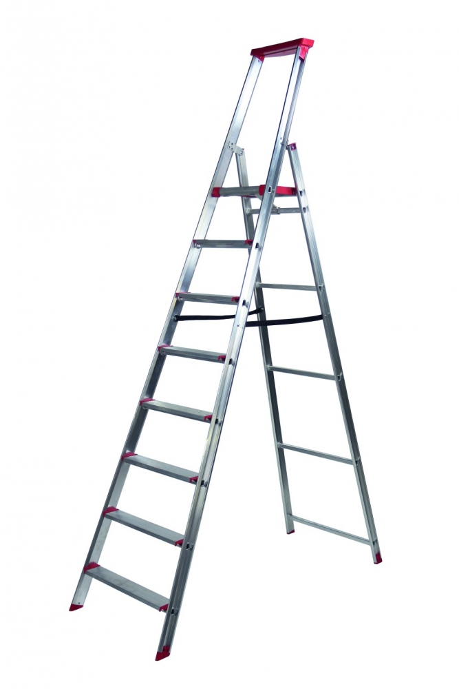 One sided step ladder with 8 steps for professional use, according to DIN EN 131, height 1.95 mThe ladder for professional use at an affordable price. The double delta profile, which is unique in Germany, enables use in conjunction with a special aluminum alloy under particular stresses. Increased resistance to dents and buckles and extremely non-slip ladder feet make the Rise-Tec® step ladders a stable work tool for daily use.Areas of applicationThe Rise-Tec® professional stepladders are TRBS 2121-2 compliant and therefore suitable for commercial work on the ladderCommercial and industrial useInstallers, painters, roofersWarehousingCaretaker serviceHousekeepingDo it yourselferCharacteristicsResistance against dents and buckles (punch-resist-effect)Single-sidedHeight (upper platform): 1.95 mExtra wide rungs (35x35mm) and 80mm steps for comfortable, safe standingRungs and steps with ribbing increase the slip resistanceFlanged connection from stile to rung and step as a permanently stable connectionExtremely anti-slip ladder feet, replaceable after wear and tearHighest stile stability against bucklingUseful storage tray for assembly material, tools, etc.Ergonomically designed aluminium stilesVery appealing designManufactured in accordance with DIN EN 131, they correspond to the „Professional class“. In terms of stability and longevity, the standard specifications are even exceeded by far. A reliable „colleague“ for your professional life.Technical specificationsAmount of steps: 8Length of stile : 286 cmHeight : 195 cmLower outer width : 65 cmDepth : 158 cmUpper platform: 33.5×25.5 cmStep depth: 80 mmWeight : 12 kgRise-Tec® professional step-ladders 8616 (3 – 12 steps)Article n°Amount of stepsLLength of stilein cmPupper platform heightin cmAworking height maxca. in cmLower outer widthin cmDepthin cmWeightin kg31507027048715,5417695295519075202120320541068623114534558123972591703706113910,582861953956515812103402454457219316123942954957922819 Optional Accessories (On request)Handrails for stepladdersSafety steps for stepladders increase the standing area to 130mm and are simply clipped on.Brake rollers for footstepsSafety bar for stepsHooks and suspension devices for stepladdersRise-Tec Red labelThe ladder for professional use at an affordable price. The double delta profile, which is unique in Germany, combined with a special aluminium alloy makes it possible to use it under special loads. The profile is used for the stepladders of the Red Label. For the rung ladders of this series we also use a specially developed double T-profile. Both profiles increase resistance to dents and buckles because of the punch-resist-effect. Information on product safety (Manufacturer, Contact)Hassler & Hassler GmbH u. Co. KG, Dieselstrasse 14, 65520 Bad Camberg, GERMANY, +49 6434 20798-60, , www.rise-tec.de