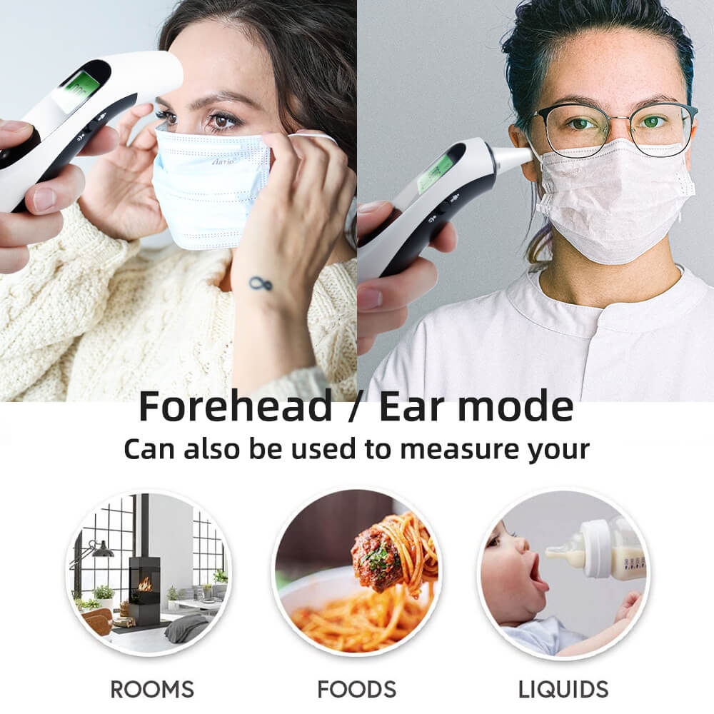Solmira Infrared Thermometer – FC-IR105 Temperature measuring function: forehead, ear, and room/objectThe ear or forehead measurement automatically converted when the probe cover is removed or covered,Automatically shut downSupports ℃/°F conversion.35 groups of memoriesWhite LCD backlight, red, orange and green LED indicator; fever warningMute/un-mute availableMeasurement range Forehead: 32.0°C – 42.9°C (89.6°F – 109.2°F) Object: 0°C – 100°C (32°F – 212°F)Measuring accuracy Forehead mode: ±0.2°C / ±0.4°F Object mode: ±1.0°C / 1.8°FMeasuring distance 1 – 3cmDisplay LCD backlightAutomatic shutdown 10s ± 1sMemory 35 groups of measured temperature.Fever alarm Low fever: 37.4°C ≤ T ≤ 37.9°C (99.3- 100.3°F) High fever: 38°C≤ T ≤ 42.9°C (100.4°F – 109.2°F)Operational conditions Temperature: 10°C – 40°C (50°F – 104°F) Humidity: 15-95%RH, non-condensing Atmospheric pressure: 86-106 kPaBattery 2 x AAA. can be used for more than 3000 times.Weight 66.8g (without battery); 81. 4g (with battery)Product dimension 39×27.3x160mmPacking size 46.5*46.5*169mmFull set weight 113g (including products/ bags/ instructions/battery) Information on product safety (Manufacturer, Contact)medisana GmbH, Carl-Schurz-Strasse 2, 41460 Neuss, GERMANY, +49 2131 3668-0, , www.medisana.de
