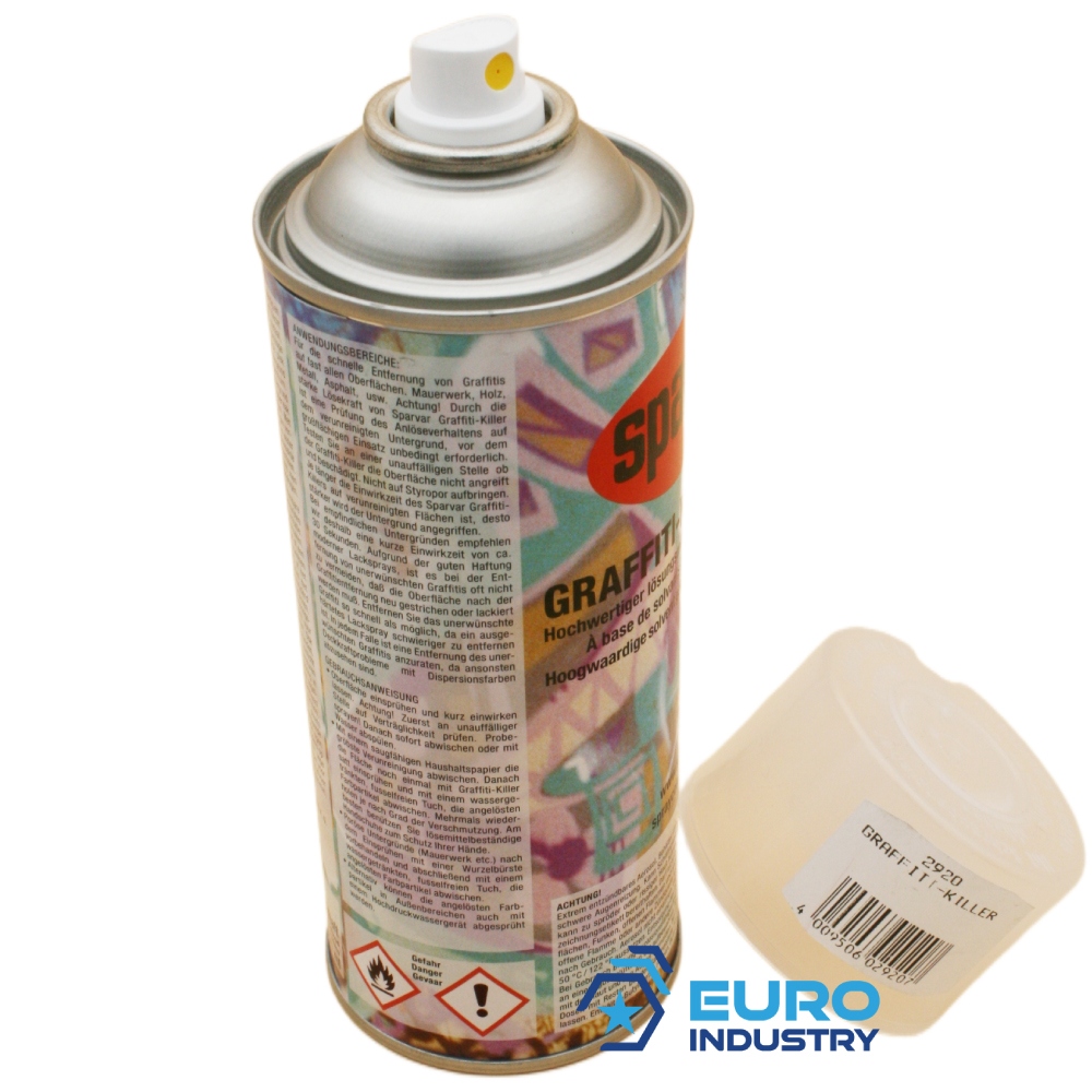 Sparvar graffiti-killer for the rapid removal of graffiti on most surfaces.Effective on shop fronts, garage doors, brickwork, stone, concrete, metalwork, masonry, wood, metal, ashphalt etc.High quality solvent-based graffiti remover propellant propane-butane, lead free, cadmium free, aromatic, biodegradable.Due to the strong solvent power of Sparvar graffiti-killer is a test on the contaminated surface absolutely required before widespread use.Test on an inconspicuous area if the surface cannot be damaged from the graffiti remover.Do not apply on vinyl-plastic or Styrofoam.The longer the exposure time of Sparvar graffiti Killers on contaminated surfaces, the stronger the base is attacked.For sensitive surfaces we recommend a short exposure time of about 30 seconds.Remove the unwanted graffiti as quickly as possible because a cured paint spray is more difficult to remove. In each case, a removal of unwanted graffiti is advised because otherwise opacity problems are foreseen with latex paints.Volume: 400 mlInstructions:Attention do the first check in an inconspicuous area for compatibility tests. Wipe with absorbent kitchen paper the grossest impurity. Then fill the area again with graffiti-killer spray and wipe with a water-soaked, lint-free cloth, the loosened paint particles. Repeat several times, depending on the degree of pollution. It is best to use solvent-resistant gloves to protect your hands.Hazard Statements (CLP)Signal word: DangerHazard Statements (H-codes)H222-229: Extremely flammable aerosol. Pressurized container: May burst if heated.H336: May cause drowsiness or dizziness.Precautionary Statements (P-codes)Prevention:P101: If medical advice is needed, have product container or label at hand.P102: Keep out of reach of children.P210: Keep away from heat, hot surfaces, sparks, open flames, and other ignition sources. No smoking.P211: Do not spray on an open flame or other ignition source.P251: Do not pierce or burn, even after use.P260: Do not breathe aerosol.P262: Do not get in eyes, on skin, or on clothing.P271: Use only outdoors or in a well-ventilated area.Response:P304+P340: IF INHALED: Remove person to fresh air and keep comfortable for breathing.P305+P351+P338: IF IN EYES: Rinse cautiously with water for several minutes. Remove contact lenses, if present and easy to do. Continue rinsing.Storage:P403: Store in a well-ventilated place.P410+P412: Protect from sunlight. Do not expose to temperatures exceeding 50°C/122°F.Disposal:P501: Dispose of contents/container in accordance with local regulations.Additional LabellingEUH066: Repeated exposure may cause skin dryness or cracking.EUH018: May form explosive/flammable vapor-air mixtures during use.
