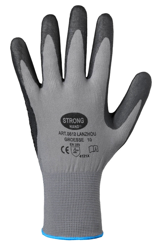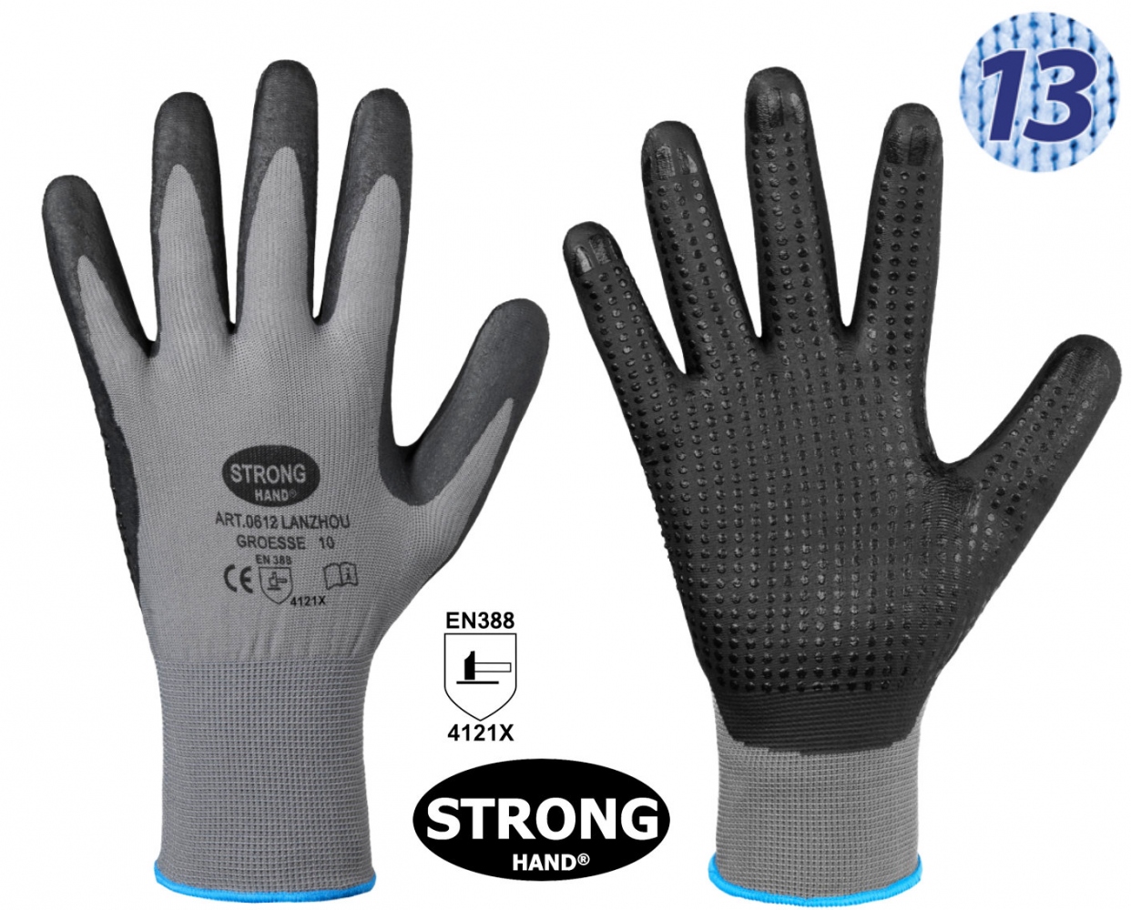 The Stronghand fine knitted safety gloves Lanzhou are equipped with a nitrile-palm-coating, which ensures a safe grip even of slippery objects.A perfect sense of touch as well as a great fit enlarge the wearing comfort.The gloves are very resistant against oils and water-repellent. Technische DatenStandard: EN388 (4.1.2.1.X)Carrier: 100% Polyester, greyCoating: nitrile foam, nitrile-studded, blackSeamless knitted / 13 GSizes: 7, 8, 9, 10, 11SpecificationsProfi qualityFine knit, seamlesslyFoam nitrile palm-coating with Nitrile pointsExcellent fitHigh level of comfortSecure grip even on smooth objectsVery good touchGood resistance to oils and greasesWater repellentHover over me Information on product safety (Manufacturer, Contact)HELMUT FELDTMANN GmbH, Zunftstraße 28, 21244 Buchholz, 04181/2004-0,