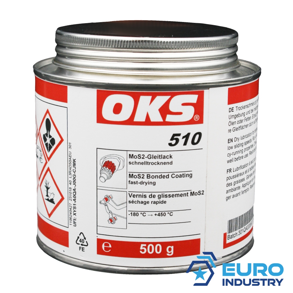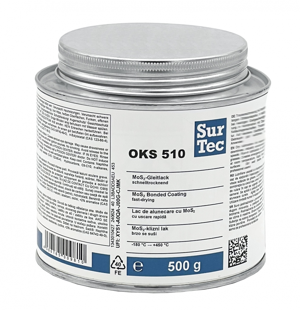 Sur Tec OKS 510 is an air-drying MoS₂-based lubricant coating used for dry lubrication of machine elements during temporary operation and long standstill periods.Field of applicationRun-in lubrication in combination with oil or grease lubricationDry lubrication at sliding pairs, in particular under heavy loads and low sliding speeds, at oscillating movements or intermittent operationDry lubrication at high operating temperatures (up to 450°C), shorter sliding paths and low speedsDry lubrication in dusty environment, to avoid adhesionsCoating of punching toolsPropertiesHighly effective due to good adhesion to prepared substratesAllows a low coefficient of sliding friction also under heavy loadingIncreased wear protectionRadiation and vacuum-resistantShortens and improves run-in conditions of friction bearings, toothings and other sliding pairsAlso available as spray version OKS 511Technical DataLower operating temperature: -180°C Upper operating temperature: 450°C Flashing point < 65 (< 5°C): -30°C Surface covering: 10-50 m²/can Density (at 20°C): 0.96 g/cm³Colour: grey-blackSize: 500gPackaging type: tinAlso available in: , and (OKS 511)IndustriesIron and steel industryRubber and plastic processingChemical industryLogisticsPaper and packaging industryRail vehicle technologyGlass and foundry industryPlant and machine (tool) engineeringMunicipal servicesShipbuilding and marine technology