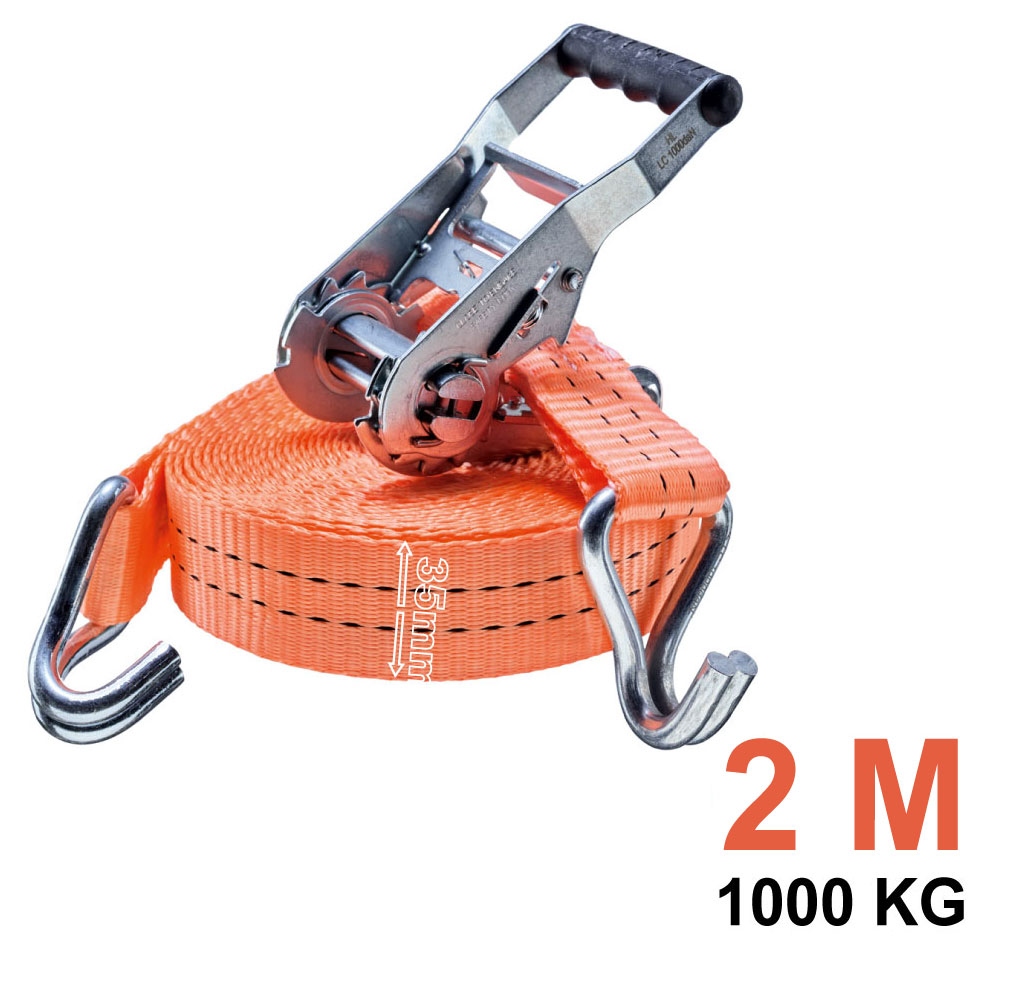 2-part cargo tie down strap, with DJ-Hook (pointed hook + ratchet)Norm: DIN EN 12 195-2Material: PolyesterStrap Width: 35 mmStrap Length: 2 mStandard Tension Force (STF): 200 daN (equivalent to 200 kg)Loading Capacity (LC) direct: 1000 daN (equivalent to 1000 kg)Loading Capacity (LC) strapping: 2000 daN (equivalent to 2000 kg)Color: orangeTÜV/GS Certified Information on product safety (Manufacturer, Contact)HELMUT FELDTMANN GmbH, Zunftstraße 28, 21244 Buchholz, 04181/2004-0,
