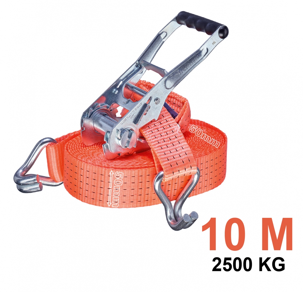 2-part cargo tie down strap, with DJ-Hook (pointed hook + ratchet)Standard: DIN EN 12195-2Material: PolyesterStrap Width: 50 mmStrap Length: 10 mLoading Capacity (LC) direct: 2500 daN (equivalent to 2500 kg)Tensile strapping LC (daN): 5000 (equivalent to 5000 kg)Standard Tension Force (STF): 300 daN (equivalent to 300 kg)Color: orange TÜV/GS tested Information on product safety (Manufacturer, Contact)HELMUT FELDTMANN GmbH, Zunftstraße 28, 21244 Buchholz, 04181/2004-0,