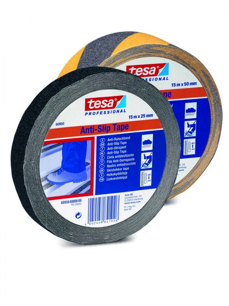 tesa® 60951 anti slip marking tape according to DIN 51130 provides strong adhesion to various surfaces. The aluminiumoxyd coated PVC backing is saltwater resistant and ensures its anti slip effect for 2 years at usual use.Technical Features:Material backing: aliminiumoxyd coated PVC-filmColor: yellow/blackAdhesive: acrylateTotal thickness: 810 μmAdhesion: 7 N/cmElongation at break: 70 %Temperature resistance: -5° C to +50° CLength: 15mWidth: 50mm Information on product safety (Manufacturer, Contact)tesa SE, Hugo-Kirchberg-Strasse 1, 22848 Norderstedt, GERMANY, +49 40 888 99 0, , www.tesa.com