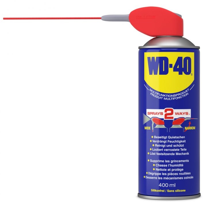 WD-40 Multi-Use Product Smart Straw 400ml spray canThe WD-40 Smart Straw has a precision applicator in order to penetrate stuck or jammed parts and provide essential lubrication, as well as displacing moisture, so you can protect your hard-to-reach parts. For a smaller surface area, for tight, hard to reach spaces and for more precision, flip the straw up, position the straw a few inches from the object and spray onto the surface.CharacteristicsSmart Straw TechnologyEasy-to-useSpray2Ways TechnologyPenetrates components to loosen stuck partsStops squeaky hingesLoosens rusted partsField of applicationRemoving rust from gardening tools and equipmentProtects battery terminals from corrosionSpark plug lubrication and maintenanceProtecting bike frames/chains from rustLubricate door locks and hingesRemoving rust from power toolsClean a greasy engineClean grime off exhaustsAdvantages of WD-40 Smart StrawWith the Smart Straw applicator, you’ve got two ways to spray; use the flip up straw for hard to reach areas, such as inside chains,locks or rollers, then flip it down to use the wide angle spray eye for area coverage on surfaces. Whichever way you need to spray,Technical specificationsAppearance: Slightly cloudyColour: Light amberOdour: Slight, characteristic odourSpecific Gravity: 0.80 at 25°CViscosity: (ASTM D445) 2.5 cSt at 40°CFlashpoint (minimum): 43°C closed cupPercent Non-volatile (minimum): 30% by weightPercent Volatile (maximum): 70% by weight aliphatic petroleum distillatePour Point: Below -73°CCoverage: 14m² to 24m² per litreBoiling Point (Initial): 149°C (minimum)Weight, applied coating: 1.7 x 10¯³ kg/m²Thickness: 0.0025mm to 0.0076mmHazard Statements (CLP)Signal word: Danger.Hazard Statements (H-codes)H336: May cause drowsiness or dizziness.H222: Extremely flammable aerosol.H229: Pressurized container: May burst if heated.Precautionary Statements (P-codes)Prevention:P101: If medical advice is needed, have product container or label at hand.P102: Keep out of reach of children.P210: Keep away from heat, hot surfaces, sparks, open flames, and other ignition sources. No smoking.P211: Do not spray on an open flame or other ignition source.P251: Do not pierce or burn, even after use.P261: Avoid breathing vapor or aerosol.P271: Use only outdoors or in well-ventilated areas.Response:P301+P310: IF SWALLOWED: Immediately call a POISON CENTER or doctor/physician.P312: Call a POISON CENTER/doctor if you feel unwell.P331: Do NOT induce vomiting.Storage:P405: Store locked up.P410+P412: Protect from sunlight. Do not expose to temperatures exceeding 50 °C.Disposal:P501: Dispose of contents/container in accordance with local regulations.Additional Labeling (EUH-codes)EUH066: Repeated exposure may cause skin dryness or cracking.Storage and DisposalStore in a cool, well-ventilated place.Dispose of in compliance with local regulations.×Hazardous materials. The forwarding charges may be raised, if shipping to: DE, AT, NL, GB, CH, CZ, IT, ES, FI, NO, BE, IE, RO, PL, FR, PT, LU, DK, LI, GR, SE, SK, BG, SI, CA, LT, EE, LV, HR, SA, Information on product safety (Manufacturer, Contact)WD-40 Company Limited Zweigniederlassung Deutschland, Siemensstrasse 21, 61352 Bad Homburg, GERMANY, +49 6172 677 450, , www.wd40.de