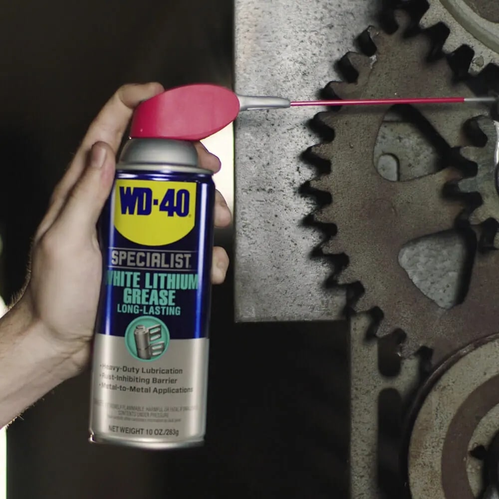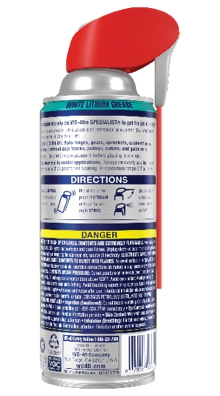 WD-40 Specialist® White lithium grease spray for heavy-duty lubricationWD-40 Specialist® White Lithium Grease is ideal for metal-to-metal applications that require heavy-duty lubrication and leaves behind a rust-inhibiting barrier for protection against corrosion. This long-lasting formula won’t melt, freeze, or run in harsh weather conditions.Whichever way you need to spray, you can rely on the clever 360° valve to work efficiently at every angle, even upside down.CharacteristicsLong-lasting lubrication and protectionWon’t freeze melt or run offNo Prop 65* ChemicalsIdeal for metal-to-metal applications50-state VOC CompliantEffective in a temperature Ranges from -25°C à +130°C Sprays upright or InvertedNSF H2 Reg. # 146864Field of applicationAuto HingesGearsSprocketsOutdoor HingesLatchesOverhead Door TracksPulleysCablesGuide RailsAdvantages of WD-40 Smart StrawWith the Smart Straw applicator, you’ve got two ways to spray; use the flip up straw for hard to reach areas, such as inside chains, locks or rollers, then flip it down to use the wide angle spray eye for area coverage on surfaces. Whichever way you need to spray, you can rely on the clever 360° valve to work efficiently at every angle, even upside down.Technical specificationsBoiling point (initial): 221-271°C (petroleum solvent)Specific gravity: 0.90Solubility in water: insoluble Ph: not applicableVapor pressure: 0.009 kpa (0.07 mm hg) at 20°c Vapor density: 5.3 (petroleum solvent)Percent volatile: <25% voc/mir: 24.9%/ 0.445Appearance/odor: off-white, slightly viscous liquid with a petroleum odor.Flashpoint: <-30°c (-22°f) (cc astm d3828) Flammable limits: lel: 0.6% uel: 5.0%Hazard Warnings (CLP)Signal word: DangerHazard Statements (H-phrases)H315: Causes skin irritation.H336: May cause drowsiness or dizziness.H411: Toxic to aquatic life with long-lasting effects.H222: Extremely flammable aerosol.H229: Pressurised container: May burst if heated.Safety Statements (P-phrases)Prevention:P101: If medical advice is needed, have product container or label at hand.P102: Keep out of reach of children.P210: Keep away from heat, hot surfaces, sparks, open flames and other ignition sources. No smoking.P211: Do not spray on an open flame or other ignition source.P251: Do not pierce or burn, even after use.P261: Avoid breathing vapours/spray.P271: Use only outdoors or in a well-ventilated area.P273: Avoid release to the environment.P280: Wear protective gloves.Response:P312: Call a POISON CENTER or doctor if you feel unwell.Storage:P404: Store in a closed container.P410+P412: Protect from sunlight. Do not expose to temperatures exceeding 50 °C.Disposal:P501: Dispose of contents/container to an approved waste disposal plant.Other HazardsThe mixture contains no vPvB substances (vPvB = very persistent, very bioaccumulative).The mixture contains no PBT substances (PBT = persistent, bioaccumulative, toxic).The mixture contains no substances with endocrine-disrupting properties.×Hazardous materials. The forwarding charges may be raised, if shipping to: DE, AT, NL, GB, CH, CZ, IT, ES, FI, NO, BE, IE, RO, PL, FR, PT, LU, DK, LI, GR, SE, SK, BG, SI, CA, LT, EE, LV, HR, SA, Information on product safety (Manufacturer, Contact)WD-40 Company Limited Zweigniederlassung Deutschland, Siemensstrasse 21, 61352 Bad Homburg, GERMANY, +49 6172 677 450, , www.wd40.de