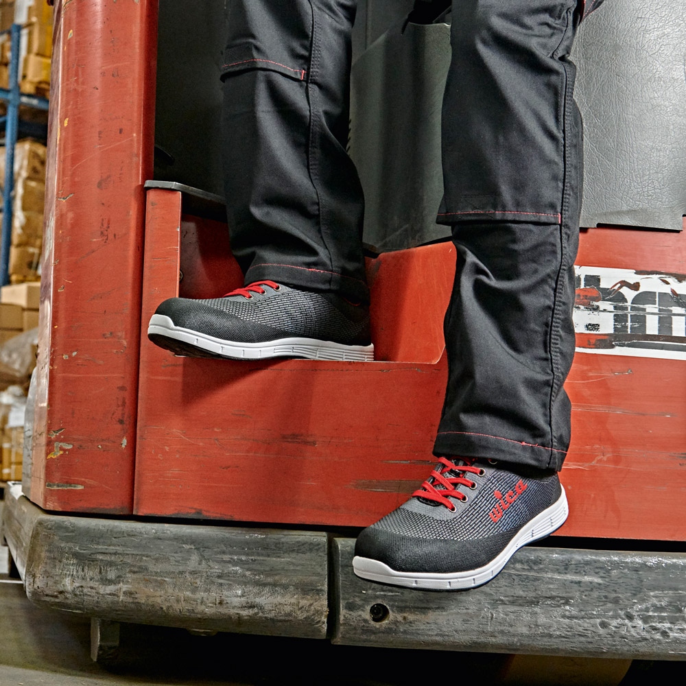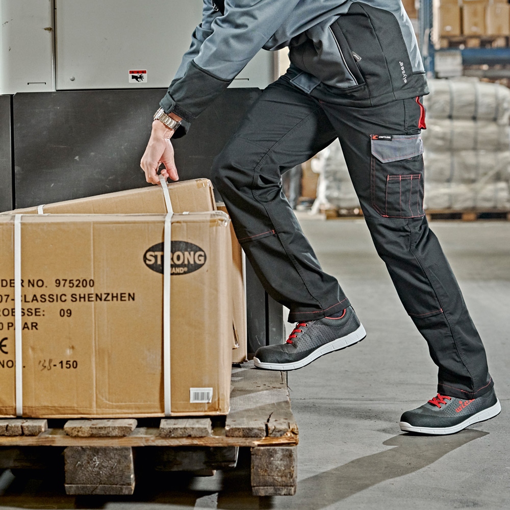 Norm: EN ISO 20345:2011 S1P SRAColor: grey/redWide: 10,5Sizes: 36-48Weight: size 42 approx. 445gDetailsUpper of breathable textile materialErgonomically formed, padded collarSewed, padded dust tongue of textile materialFastening by metal eyeletsRemovable and anatomical foodbedBreathable liningAttracting help on the heelCorrosion-free steel toe cap and composite midsoleSporty, antistatic, oil- and acid-fast, slip resistant 2-density EVA/Rubber soleIncluding 1 pair additional laces in red